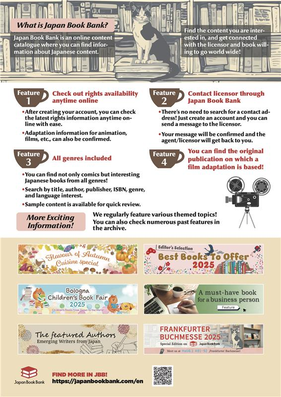 You can read the book samples of that are featured, and a QR code on the book will lead you to rights and publisher information in Japan Book Bank on the spot!